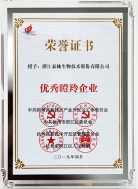 5月,濱江區召開全區經濟會議,區黨委、區管委會、區政府對全區“優秀瞪羚企業”進行表彰,泰林生物憑借突出的創新成就、優異的企業成長性成功入選百家“優秀瞪羚企業”。